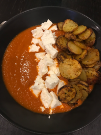 Pour notre dernier repas de la journée nous avons mangé une soupe de poivrons et tomates, agrémentée de pommes de terre croquantes et féta.