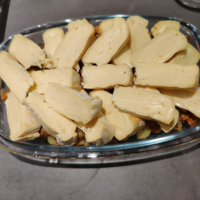 9. Dans un plat qui va au four étaler une couche de pommes de terre, d’allumettes de tofu marinées, et une couche de fromage.