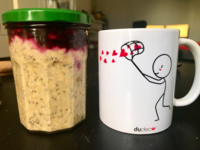 Je commence ma journée avec un porridge overnight peanut butter et jelly avec un café latte au caramel.