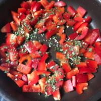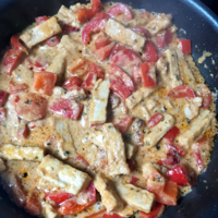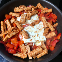 A midi, nous avons mangé un plat inspiré de la recette virale « feta et tomate ». J’ai commencé a faire griller des poivrons, j’ai rajouté un peu d’eau avant de mettre le bloc de féta, puis j’ai rajouté de la fausse viande (imitation poulet). J’ai salé, poivré et rajouté des épices tout en remuant fréquemment. J’ai fini le plat en ajoutant des pâtes !