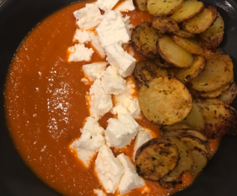 Pour notre dernier repas de la journée nous avons mangé une soupe de poivrons et tomates, agrémentée de pommes de terre croquantes et féta.