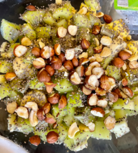 Pour la salade de fruits : j’ai coupé de la mangue, des kiwis et une banane. J’ai ajouté des morceaux d’ananas. Pour un peu plus de mâche ? j’ai mis des noisettes grossièrement coupées et des graines de chia.