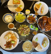 Nos invités ont ramené les viennoiseries, le pain et le fromage.