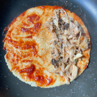 Tremper le wrap dans la sauce recto et verso, mettre dans une poêle chaude, ajouter les champignons, du fromage et du fromage frais. Fermer le wrap et faire griller de chaque côté.